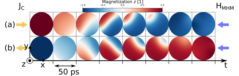 compared to the results for an external field presented earlier. As expected, the switching dynamics are similar to those with an external field, where a domain wall nucleates at the edge and propagates diagonally to the current