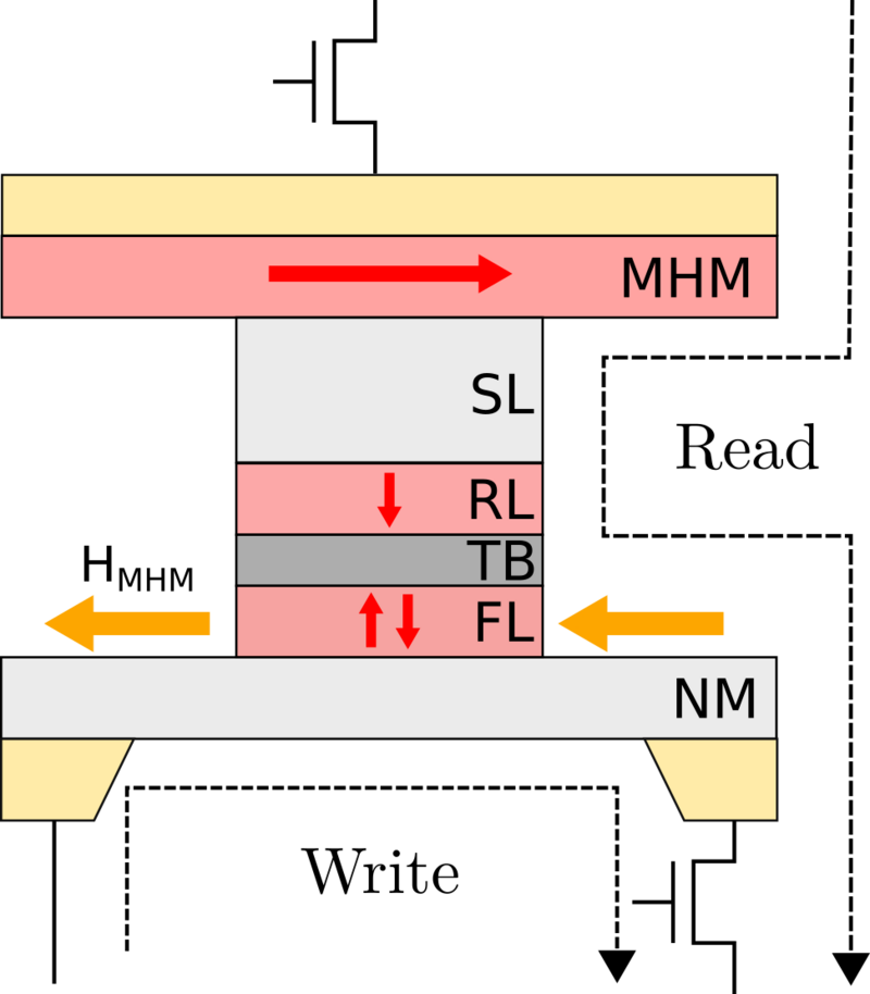 (MHM) is placed above the MTJ with a SL in between. The magnitude of the stray field depends on the thickness of the MHM and the distance between the MHM and the FL, which can be adjusted by changing the thickness of