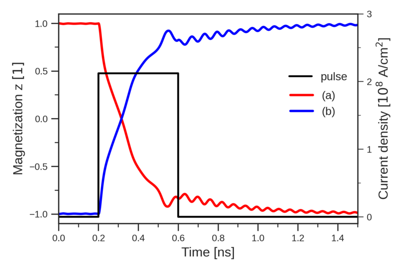 Figure 8.11: The \(z\)-component of the volume averaged magnetization and the applied current density as a function of time. The red curve shows the switching from \(+z\) to \(-z\) with a current along \(+x\) (a), while