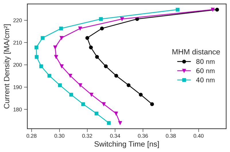 As the strength of the stray field is determined by the material and the volume of the MHM, along with the distance between the MHM and FL, the window of possible switching current densities is limited, as switching is only