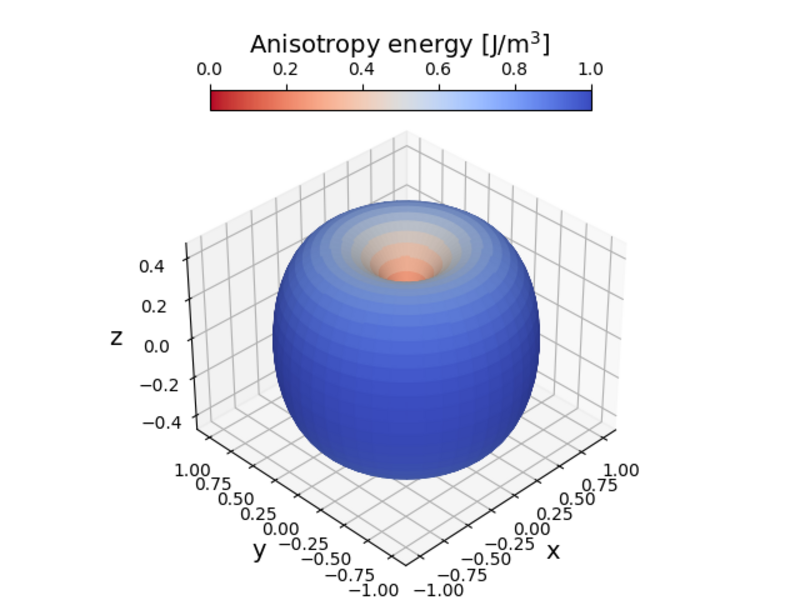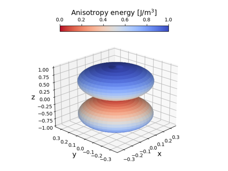 where \(K_1\) and \(K_2\) are the first and second order anisotropy constants, respectively. When \(K_{1/2} > 0\), it is energetically favorable for the magnetization to align along the easy axis, while when \(K_{1/2} <