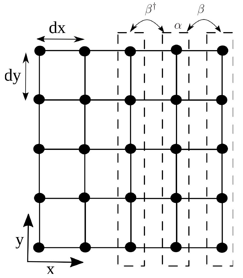 calculating the electronic structure of semiconductors. It is also referred to as Bloch or linear combination of atomic orbitals (LCAO) method [31]. The Hamiltonian matrix for a simplified 2D system, using the TB method is described as follows: The 2D structure in Fig. 2.1 is composed of