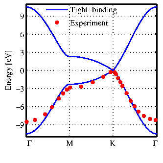 . The bandstructure of graphene along the high-symmetry band line is shown in Fig. 2.3. The tight-binding results are in good agreement with experimental data taken from [33], in particular