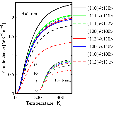 oriented nanowires have the highest thermal conductance [111,107]. A similar conclusion was found for thin layers of larger sizes [112]. As it will be explained in next section, the phonon dispersions along the