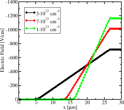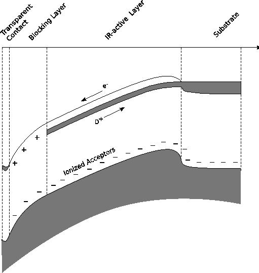It should also be noted that the field distribution does not depend on the majority doping, which forms the impurity band. In principle, a higher donor concentration leads to higher quantum efficency, but also introduces band broadening, which in turn leads to unwanted thermal dark current.