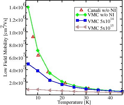 Figure 6.4 depicts the low field mobility of electrons in Si in the low temperature regime. Shown are MC simulation results based on phonon scattering and in addition neutral impurity scattering when indicated. It is shown that neutral impurities cause a mobility reduction at low temperatures, and therefore neutral impurity scattering has to be considered in simulation of BIB devices.