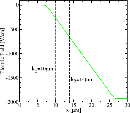 For the following simulations the field distribution is obtained by a conventional TCAD simulator and then passed to the Monte Carlo simulator, here VMC. Then a non-selfconsistent Monte Carlo simulation is performed.
