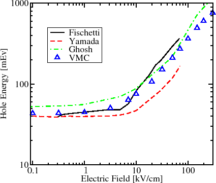 versus the inverse electric field. Monte Carlo result (VMC) is