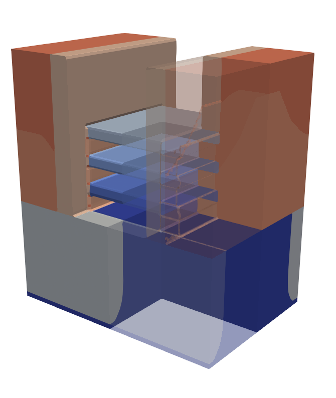 The final structure clearly shows all the relevant features, including the crystal facet dependent shape of the epitaxially grown S/D contacts. The epitaxial growth is the only process step emulated using iterative advection, as the temporal evolution of the crystal facets dominates the final geometry, which cannot be represented appropriately using geometric advection. However, since no expensive MC ray tracing simulations are required, only the computational cost of the SLLF advection scheme is incurred. Therefore, the entire structure could be generated in a matter of a few minutes, which allows for changes in the process flow to be made quickly and effectively, resulting in a structure that could be used for subsequent device simulation within a design technology co-optimisation (DTCO) flow straight-forwardly.