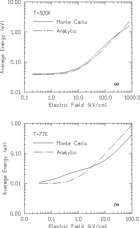 Die so definierte Energierelaxationszeit kann als Funktion der Feldstärke mit Hilfe der Monte-Carlo-Methode ausgewertet werden. Abbildung 6.4 zeigt einen Vergleich der Ergebnisse bei einer Gittertemperatur von 77K und 300K.