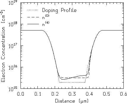 In Abbildung 7.1 werden die Trägerkonzentrationen mit dem Dotierungsprofil (punktierte Linie) innerhalb der Diode verglichen. Die strichlierte Linie stellt die Anfangslösung für die Trägerkonzentration dar, die aus einer selbstkonsistenten Drift-Diffusionssimulation stammt. In der mittleren Zone ist diese Konzentration konstant. Aus der eindimensionalen Kontinuitätsgleichung