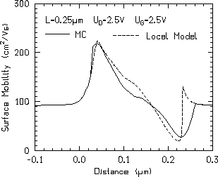 Daß sich die lokale Beweglichkeit (strichliert) nach dem Minimum rascher erholt als die nichtlokale, hängt damit zusammen, daß bei der ersteren keine Trägertemperatur berücksichtigt wird. Im Monte-Carlo-Modell besitzen die Elektronen in diesem Minimum eine hohe Energie. Diese muß erst wieder an den Halbleiter abgegeben werden, damit die Beweglichkeit wieder zunehmen kann.