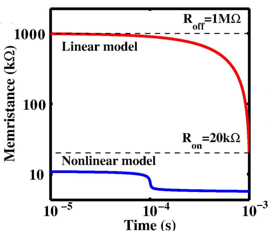from the linear and nonlinear ionic drift models. Due to a high voltage level applied (