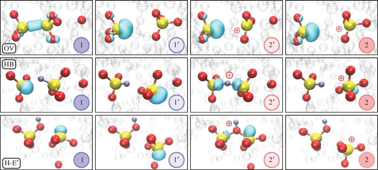 Figure 2.3: The atomistic configurations of the oxygen vacancy (OV), the hydrogen bridge (HB) and the hydroxyl-E’ center (H-E’) show that these defects can be described with a 4-state NMP model. The defects show two