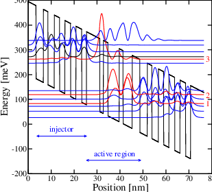 Figure 6.3 illustrates the conduction band profile of this device. The layer sequence of one period belonging to the GaAs/Al0.33Ga0.67As structure, in nanometers, starting from the injection barrier is: 5.8, 1.5, 2.0, 4.9, 1.7, 4.0, 3.4, 3.2, 2.0, 2.8, 2.3, 2.3, 2.5, 2.3, 2.5, and 2.1, where normal scripts represent the wells, bold the barriers.