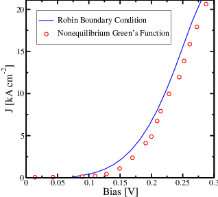 The ability of the Robin boundary conditions to produce satisfactory current carrying states is also verified by comparing our results for the tunneling current density with calculations based on nonequilibrium Green’s functions (NEGF) [1]. For this purpose a typical example of a midinfrared quantum cascade laser is considered [9].