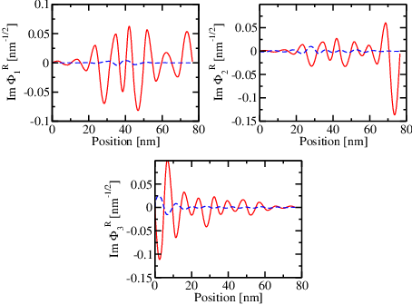 The imaginary components of the wave functions corresponding to the Robin boundary value problem are plotted in Figure 6.6. At the very small electric field F = 10-6 kV/cm the imaginary part is almost zero everywhere except some very small peaks whose magnitudes are insignificant compared to the imaginary part of the wave function at F = 103 kV/cm.