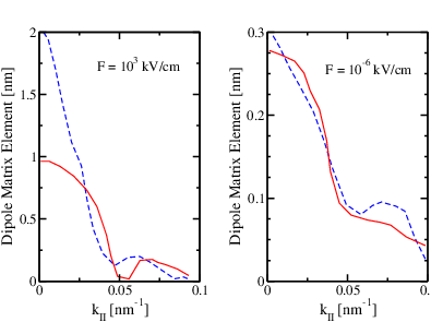 In order to obtain numerical illustrations for zαβ = ei2πk∥∕k∥max ∫ 0LzΦα⋆(z)Φβ(z)dz, the product |x ∥ | cos(x∥,k∥) is set to 2π∕k∥max, and k∥max = 0.1nm-1. The calculations of the dipole matrix elements, which performed for the two different electric field strengths 103 kV/cm and 10-6 kV/cm, are illustrated in Figure 6.8 as functions of the wave vector k∥. The dashed curves represent the results determined taking into account Robin boundary conditions and the solid curves result from Dirichlet boundary conditions. A comparison of the results belonging to the different electric fields reveals that the solutions of the Robin and Dirichlet boundary value problems converge when lowering the electric field. Thus, our calculations demonstrate the accuracy of the proposed Robin boundary conditions for QCL simulations. However, for the unbiased case Dirichlet boundary conditions yield nearly comparable results.