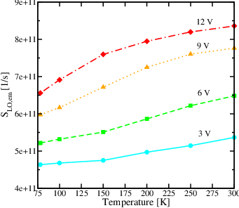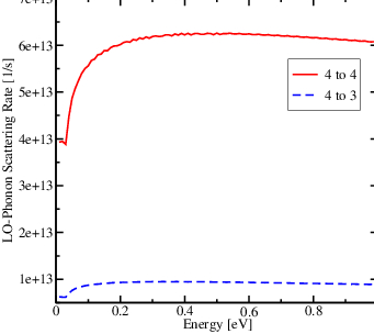 The scattering rate due to emission of polar optical phonons as a function of temperature for different bias points is plotted in Figure 6.26. A weak temperature dependence can be seen from this diagram.