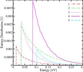 Starting with a constant population initially assigned to each subband and using a constant time step of 5 fs we have monitored 10000 particles during 10 ps. Initially each subband has an equal number of particles, and subsequently the ensemble evolves until the simulation ends. After each time step the statistics are updated. The numerical model for the QCL structure studied includes five subbands per stage and periodic boundary conditions are imposed [113].