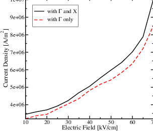 Figure 6.13 displays the obtained current density with and without X valley transport, where the range of the applied field is 10 to 70 kV/cm and the chosen calculation step is 5 kV/cm. The results demonstrate that for this QCL structure the inclusion of Γ-X intervalley scattering leads to an increase in the current flow. Without Γ-X electron transfer the results are up to 10 % lower.