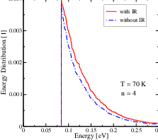 Figure 6.11 shows the time evolution of the current density with and without Γ-X intervalley scattering at an electric field of 10 kV/cm. It can be seen that the inclusion of intervalley scattering increases the current density indicating that the Γ-X electron transfer plays a significant role as a mechanism for depopulation of the lower laser level. In Figure 6.12, the obtained electron distributions of the individual subbands are depicted over the kinetic energy.