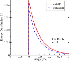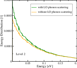 The dominance of electron scattering due to polar optical phonons is clearly illustrated by Figure 6.27 where the energy distributions of the upper and lower laser levels are depicted. The orange curves show the results without polar optical phonon scattering and the green ones illustrate the results including scattering due to polar optical phonons. We observe an increase in the occupation of the upper level and the lower level, while the increase of the upper level is much more significant compared to the lower level. The results plotted in this Figure fully support the notion that the polar optical phonon scattering mechanism is essential in order to provide a good condition for population inversion.