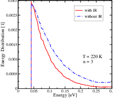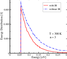 In Figure 6.14 and 6.15 we show the calculated electron distributions of the upper and lower subband for different temperatures. In general, the interface roughness scattering is found to be more dominant for higher temperatures. Moreover, it changes the occupation of the upper and lower laser levels significantly. We observe an increase in the occupation of the upper laser level due to interface roughness, while the occupation of the lower laser level gets reduced. The variations of the occupation due to rough interfaces increase with temperature, and for 300 K the variation can be as large as 27%, which illustrates their important influence on this THz QCL design.