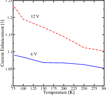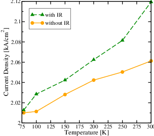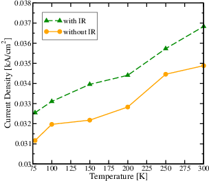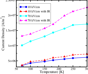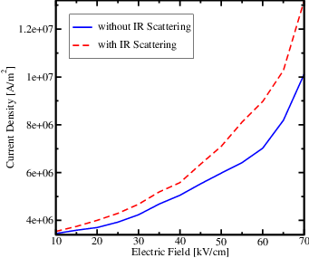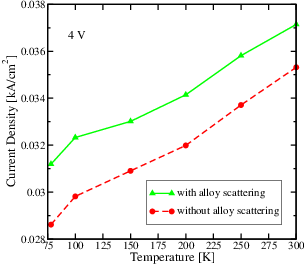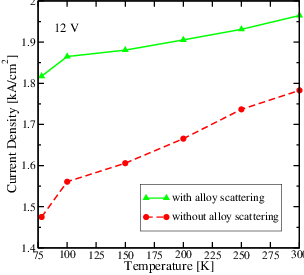 Figure 6.25 shows the current density as a function of the temperature with and without interface roughness scattering. We observe a weak dependence of the current density on temperature, which can be explained by the dominance of electron scattering due to PO-phonon emission.