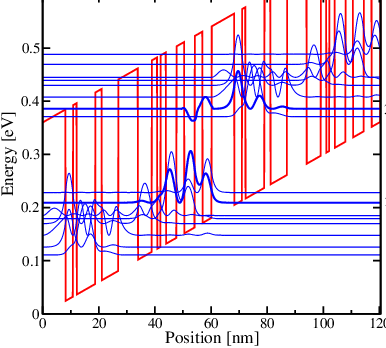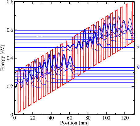 The structure considered consists of a combination GaAs wells and Al0.15Ga0.85As barriers [110]. The layer sequence of one cascade, in nanometers, is: 9.2,3,15.5,4.1,6.6,2.7,8,5.5, where normal scripts denote the wells and bold the barriers. Only the widest well is n-type doped with a low density of 1.8 × 1010 cm-2. Together with the squared envelope functions of the relevant bound states, the conduction band profile is plotted under an applied bias of 10 kV/cm in Figure 6.9.