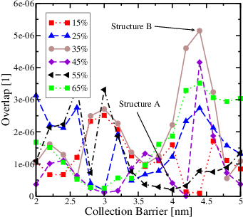 Figure 6.19 shows the overlap between the lower Γ-state and the upper X-state of two adjacent stages for different Al contents and collector barrier widths. Regarding structure B, these results suggest to set the collector barrier width to 4.5 nm and the Al content to 35 %.