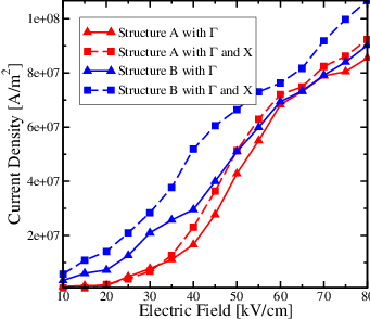 Our results indicate a significant increase in current density when considering Γ-X intervalley scattering for the modified structure B, whereas structure A shows negligible deviations. Figure 6.22 shows the obtained current densities for both structures in dependence on the electric field and highlights the importance of intervalley charge transport for QCL design considerations [118].