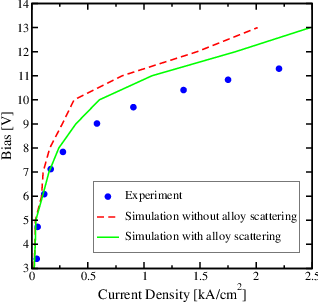 Figure 6.28 shows the calculated voltage-current characteristics when the alloy scattering is included in the simulation which is performed at 78 K. Due to its significant effect on the simulation results, the comparison with the experimental measurements gets sensitively better. In the following, we will investigate the impact of alloy scattering for higher temperatures. Table 6.5 shows the temperature dependence of the band gap energies of In0.53Ga0.47As and GaAs0.51Sb0.49 as well as the conduction band discontinuity [4]. Figure 6.29 illustrates the effect of the alloy scattering mechanism in dependence on the temperature. This scattering mechanism is mostly dominant at low temperatures, and somewhat weaker at high temperatures. This circumstance is also depicted in Figure 6.30. The ratio of the calculated current densities with and without taking into account alloy scattering is shown. We conclude that the alloy scattering mechanism is necessary to be considered in transport modeling of QCLs, especially in the low temperature region.