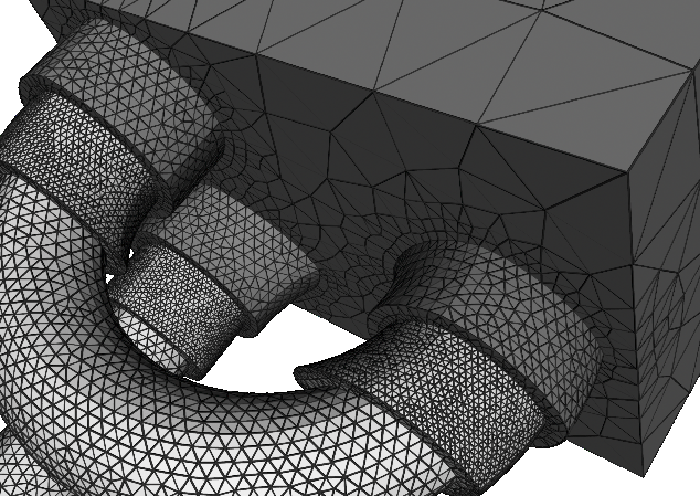 As an example a conducting inductor (Fig. <5.1>) placed in an insulating rectangular brick domain (Fig. <5.2>) is discretized and visualized. Similar structures will be used in the application part of this work, where the simulation results of the vector finite element algorithm are demonstrated. The inductor is colored bright and the insulator dark. Normally the inductance and the resistance of the inductor at different frequencies must be calculated, which requires the extraction of the magnetic field distribution and the current density distribution in the simulation domain. If the operating frequency is sufficiently high for the dimensions of the corresponding domain parts, skin effect is observed. The current is forced to flow only on or near the surface of the inductor wire. There is no current flow inside of the inductor wire. In such cases it is convenient to produce the finest mesh on the surface of the wire and in the area close to the boundary between the inductor and the insulating environment. Deep inside and far outside the wire coarser mesh elements can be used as shown in Fig. <5.3> and Fig. <5.4>.