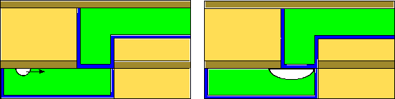 Figure 1.2 shows two typical failures in a copper dual-damascene line [12]. In the first case the void nucleates right under the via, so that the failure tends to occur soon after nucleation. Thus, the time to failure is dominated by the nucleation period. In turn, if the void nucleates away from the via, the void has first to migrate towards the via, where it then grows to cause the failure. Therefore, the lifetime is dominated by the void evolution phase [12].