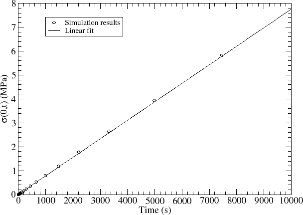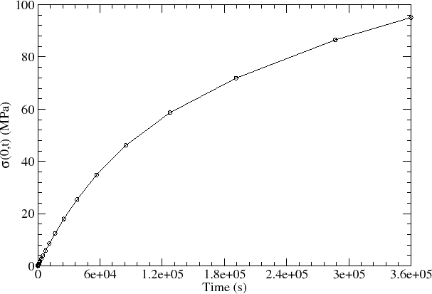 The initial stress build-up closely follows the first period of increase of the vacancy concentration. As the quasi steady state is reached, the stress grows approximately linearly with time, shown in Figure 5.11. It corresponds to a period of transition from lower to higher values of stress. At first, the low stress does not affect the equilibrium vacancy concentration. However, as the stress magnitude increases, the equilibrium vacancy concentration also increases, which, in turn, affects the stress build-up due to the generation/recombination term given in (5.11). As a consequence, the third period is characterized by a non-linear increase of the stress until the true steady state is reached, as can be seen in Figure 5.12. The correspondence between these periods of vacancy development with mechanical stress build-up was already observed by Kirchheim [53].