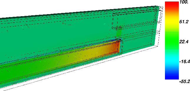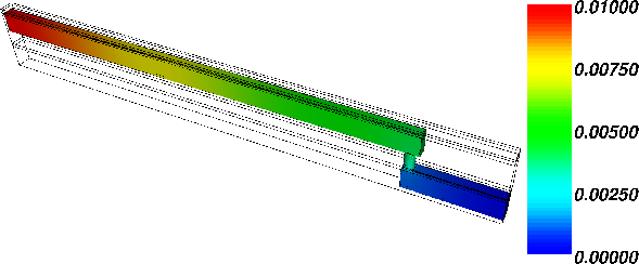 The current density is larger in the via than in the line, because the via has a smaller cross section than the line. This larger current density yields a higher joule heating in the via, which, in turn, leads to an increase of the temperature in this region, as shown in Figure 5.20. However, the external boundaries of the passivation are kept at the test temperature, 573 K, so that the temperature increase in the via is very small, and the entire interconnect practically remains at the same temperature. In fact, the temperature increase in the via is so small that it cannot significantly affect the vacancy transport.