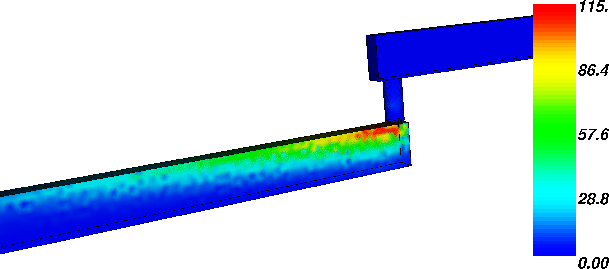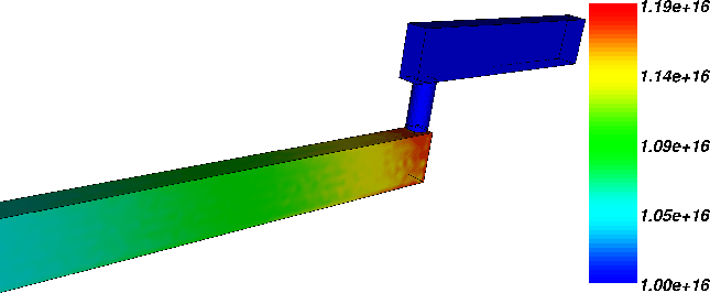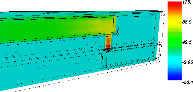 The vacancy concentration and the stress distribution for the downstream case are shown in Figure 5.27 and Figure 5.28, respectively. The main difference here is that the peak of the hydrostatic stress is not located right underneath the via, but is shifted to its edge, where there is an intersection between the copper, the capping layer, and the barrier layer. Since this intersection is likely to be a site of weak adhesion, void nucleation should occur at this edge, instead right underneath the via. This is in agreement with the observations commonly made in electromigration experiments [24].