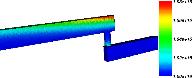 Given the conditions above, vacancies are driven by electromigration from the left to the right end of the line. Since the bottom of the via is a blocking boundary, vacancies accumulate at this region, as shown in Figure 5.21. The increase in vacancy concentration at the via bottom is accompanied by the build-up of a tensile stress, shown in Figure 5.22.