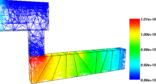 Figure 5.37 shows the vacancy distribution in a bamboo-like interconnect via. The current flows from right to left, driving vacancies towards the via. Vacancies concentrate at this site, because the barrier layer blocks further vacancy diffusion into the upper metal line. Thus, the maximum vacancy concentration is located underneath the via. However, as already pointed out, grain boundaries also act as fast diffusivity paths. Consequently, vacancy diffusion along grain boundaries is an important transport mechanism, which leads to higher vacancy concentration along the grain boundary planes, as shown in Figure 5.37.