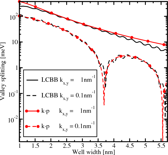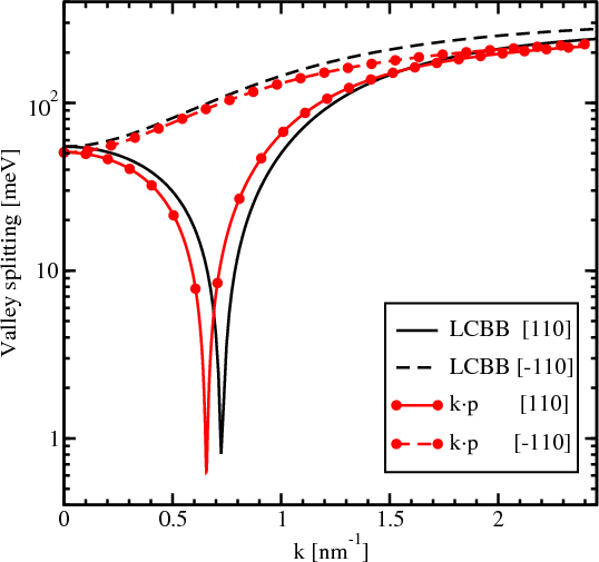 The valley splitting in a quantum well as a function of the well width is shown in Figure 5.5. The in-plane wave vector k along the [110] direction is chosen. The results for the wave vectors with the components kx=0.1nm-1, k y=0.1nm-1 and kx=1nm-1, k y=1nm-1 are shown for convenience. As predicted [38, 118], the valley splitting develops sharp minima for small values of k. For larger k the valley splitting computed with the k⋅p method decays monotonically when the film thickness is increased. The results obtained by the LCBB methods are in good agreement with those obtained by the k⋅p approach.