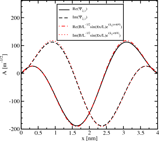 The eigenvector for the Hamiltonian (Equation 5.18) for the lowest subband is a four-component vector. For k = 0 spin-up and spin-down states are eigenstates, i.e. spin-up wave-function does not contain any spin-down states and vice versa. For kx≠0 or ky≠0 the spin-orbit term does not vanish, thus, two eigenstates are mixed. Therefore, the four-component wave function for spin-up electron contains a finite but small part of the spin-down state. Figure 5.7 shows the small spin-down component of the spin-up wave-function in a valley along [001] direction. The wave functions is quite accurately described by its envelope function times the phase factor eik0z+ϕ, where ϕ is the wave functions phase.