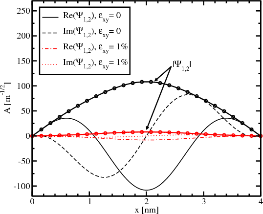 Figure 5.8 and Figure 5.9 show the majority and the minority components of the spin-up wave function for different shear strain values. The absolute value of the small part of the wave function shown in Figure 5.8 significantly decreases with strain applied. The derivative at the interface also becomes smaller for the strain value of 1% compared to the unstrained wave function. The absolute value of the big component of the wave function shown in Figure 5.9 changes insignificantly.