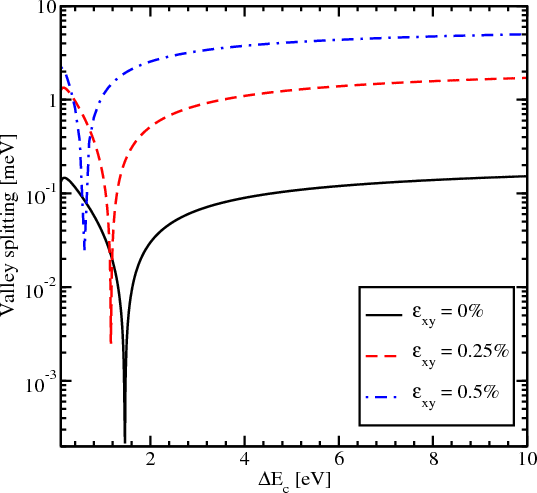 The valley splitting dependence on strain as a function of the conduction band offset for the film of 3.3nm thickness is shown in Figure 5.14. Without shear strain the valley splitting is significantly reduced around the conduction band offset value of 1.5eV. For the shear strain value of 0.25% and 0.5% the sharp reduction of the conduction subbands splitting shifts to a smaller value of ΔEC. However, the region of significant reduction is preserved even for the large shear strain value of 0.5%. The value of the valley splitting at saturation for large shear strain is considerably enhanced as compared to the unstrained case.