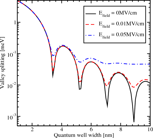 For an electric field of 0.05MV/cm the quantum well width must be larger than 6.9nm in order to observe the valley splitting independent on the quantum well width. This value is in good agreement with the simulation results shown in Figure 5.18.