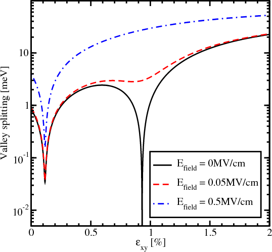 Figure 5.19 shows the dependence of the valley splitting on strain. Without electric field the valley splitting reduces significantly around the strain values 0.116% and 0.931% as shown in Figure 5.19. With electric field applied the minimum around the strain value 0.931% becomes smoother, however, for a strain value around 0.116% the sharp reduction of the valley splitting is preserved. For a large electric field the valley splitting reduction around the value 0.931% vanishes completely.
