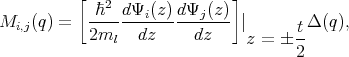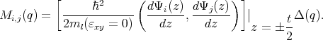 Here, Δ(q) is the Fourier transform of the random variation of the interface position with respect to the in-plane r coordinate, q is the wavevector change due to scattering, Ψi,j are the subband eigenfunctions in a silicon film, and t is the film thickness. The generalization of this expression to the k⋅p theory when the subband functions consist of several components is required. An additional difficulty appears in strained films where the longitudinal mass is the function of shear strain