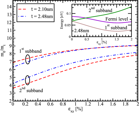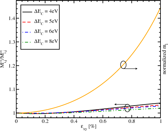 The observed effective mass obtained from the ratio of the matrix elements calculated with two different methods changes only a little with strain. These changes are becoming smaller as the conduction band offset increased. It means that the longitudinal effective mass in Equation 6.1 must not depend on shear strain. Therefore, within the k⋅p method the surface roughness scattering matrix elements are generalized as
