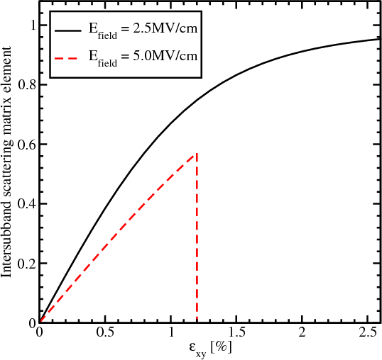 The intrasubband scattering matrix element in the second subband displays a slight decrease with strain increased, which saturates at high strain. In the high strain limit the second subband, which was equivalent to the first unprimed subbands in the unstrained film, transforms into the second subband of the triangular well potential. Thus the carriers are located effectively further away from the interface. This reduces the value of the intrasubband scattering matrix elements as compared to the unstrained case, in agreement with Figure 6.2. The dependence on the electric field is explained by a slight reduction of the derivative of the wave function at the interface due to its stronger penetration under the potential barrier for higher effective fields.