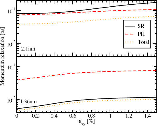 Figure 6.5 shows the dependence of the different mechanisms of the momentum relaxation together, including the total momentum relaxation time, as a function of shear strain. The improvement of the momentum relaxation time due to the shear strain is around 82% for the film thickness of 2.1nm and around 120% for the film thicknesses 1.36nm. The acoustic phonons limited momentum relaxation improves around 45% for 2.1nm and around 92% for 1.36nm. The surface roughness limited momentum relaxation time increases around 110% for 2.1nm and around 120% for 1.36nm. Due to the dominant surface roughness mechanism for the film thickness of 1.36nm, the increase of the total momentum relaxation time is higher for 1.36nm than for 2.1nm. The increase of the momentum relaxation time is due to the corresponding scattering matrix elements dependence on strain. Combined with the strain induced transport effective mass decrease it should result in an even better mobility improvement supporting the use of uniaxial tensile strain as the mobility booster in fully depleted ultra-thin SOI FETs.